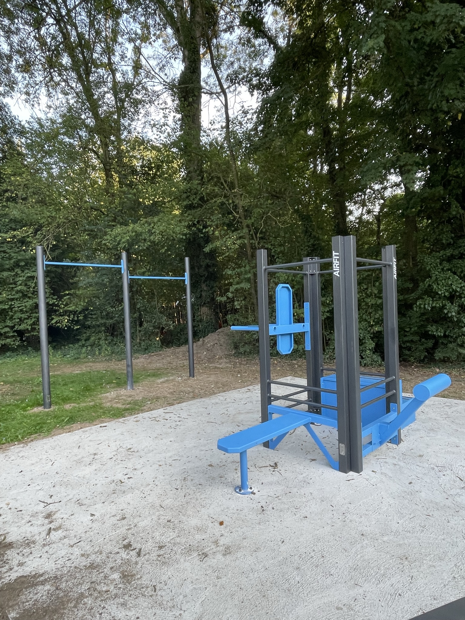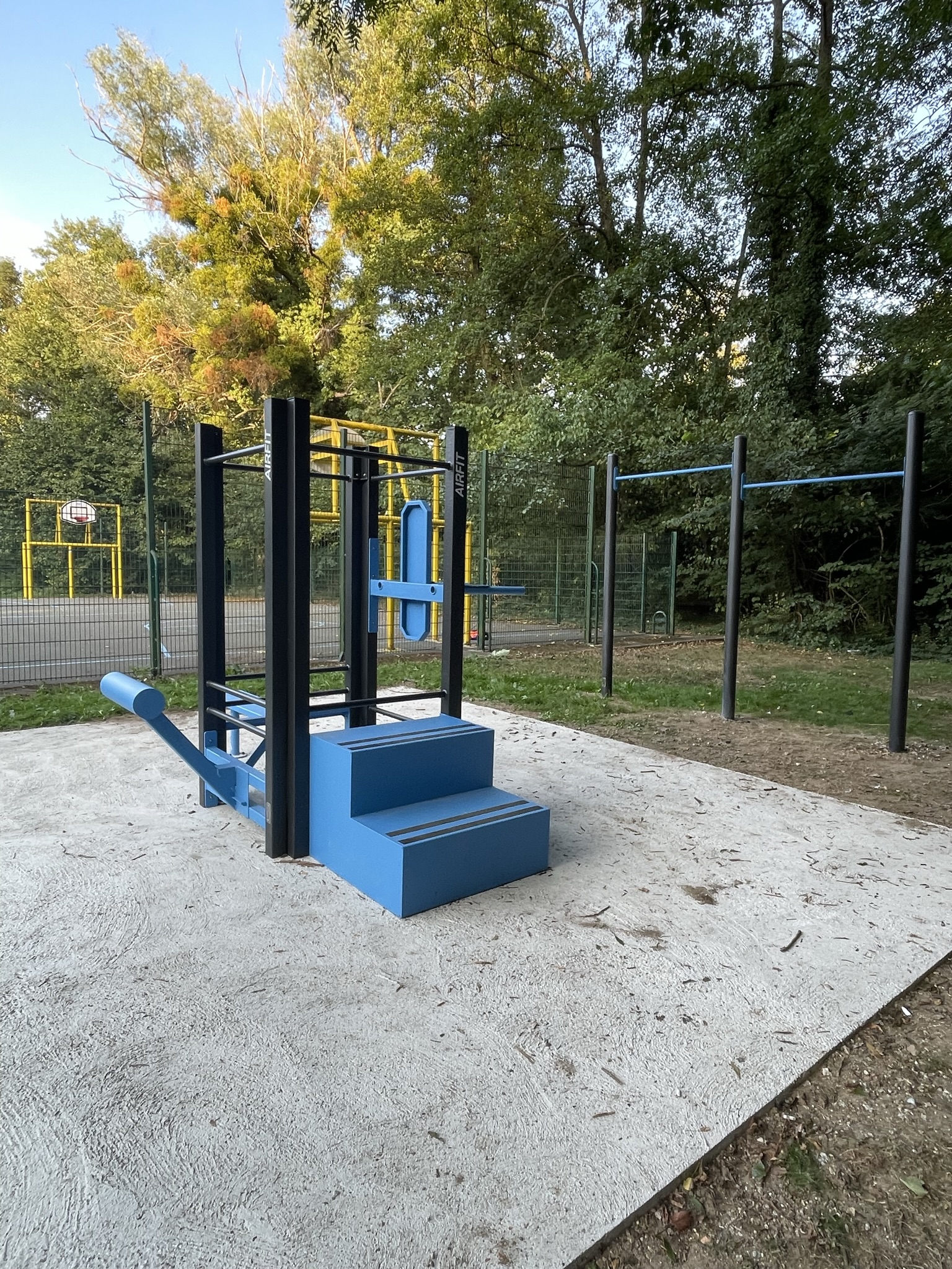 Cette aire de CrossFit se compose d’un banc abdos, d’une chaise romaine, d’un banc lombaire, d’un escalier… et est complétée par un équipement de Street Workout, avec une double barre de traction.